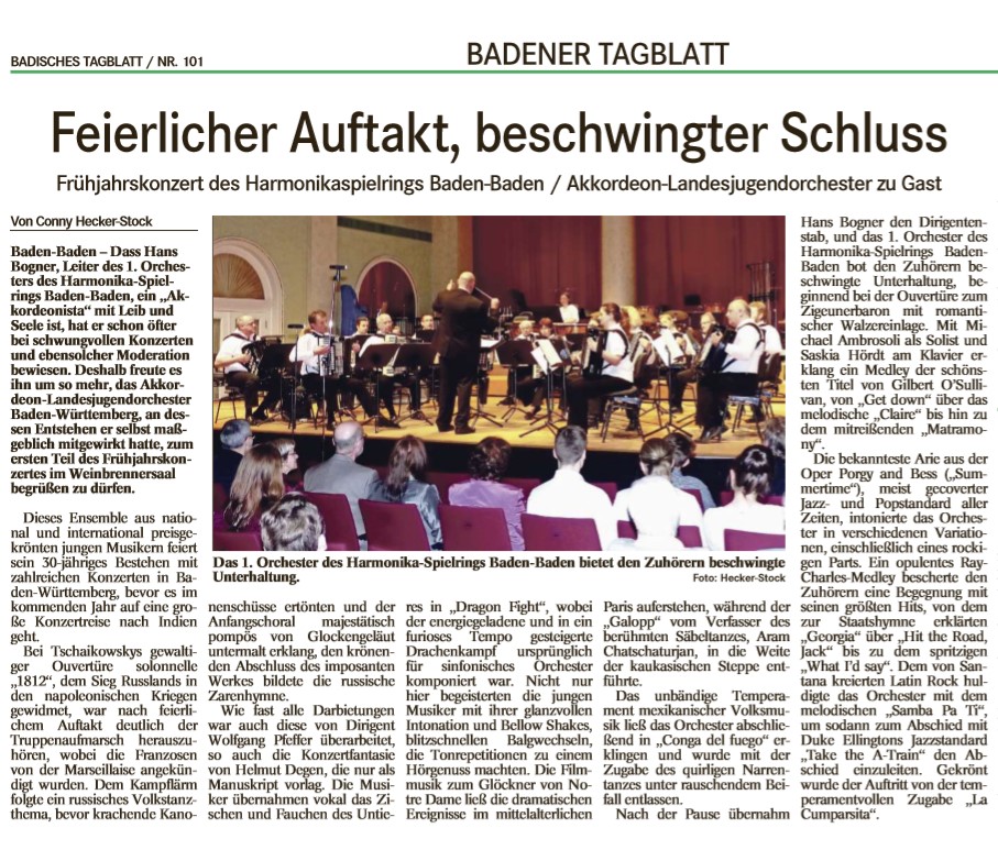 Den zweiten Teil des Abends gestaltete das 1. Orchester des Harmonika-Spielrings Baden-Baden unter der Leitung von Hans Bogner mit einem abwechslungsreichen und unterhaltsamen Programm. Auch hier zeigte sich das Publikum begeistert, worauf eine Zugabe mit einer Gesangseinlage des Dirigenten folgte.
